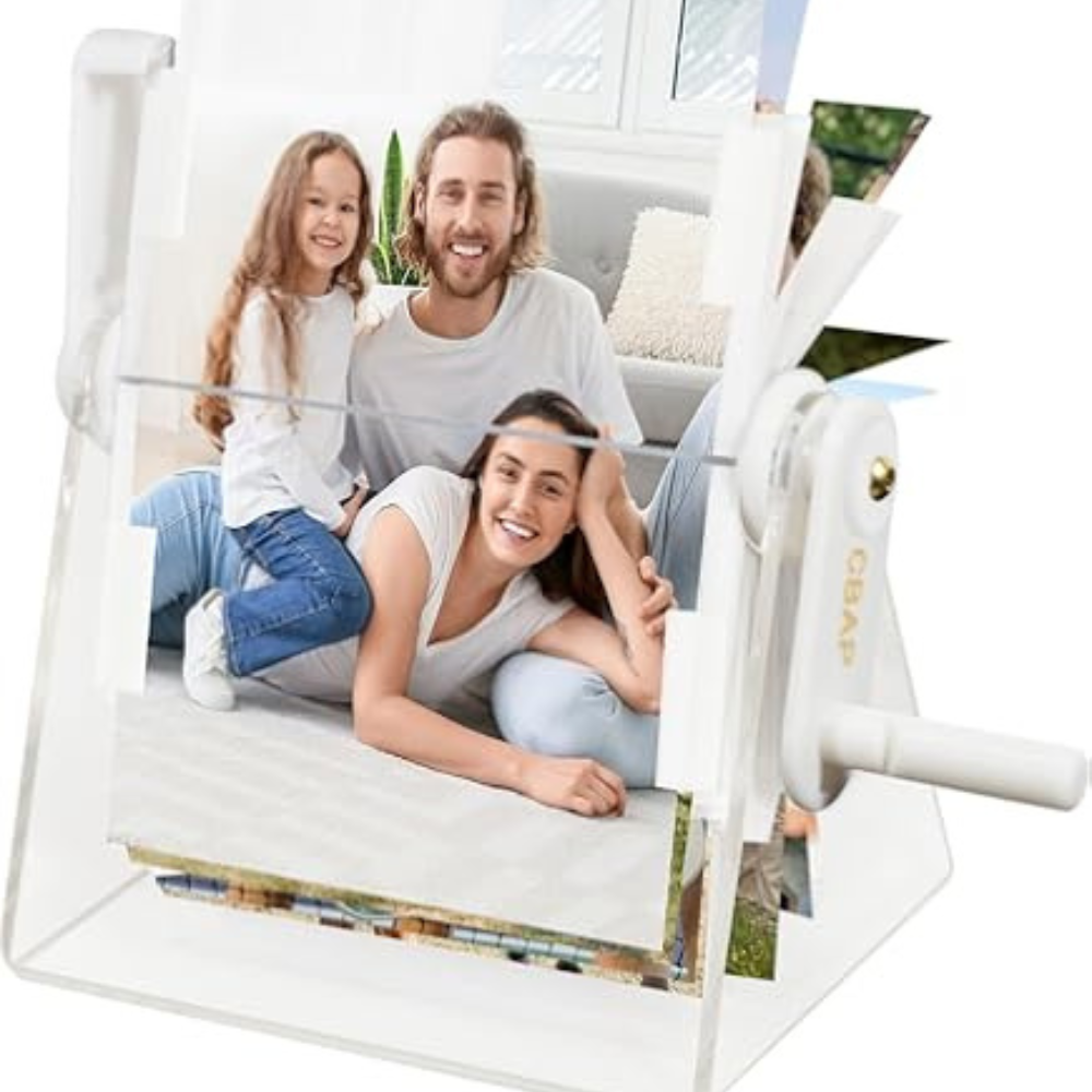 | The image is a type of rotating photo display wheel or Ferris wheel picture frame designed to showcase multiple photographs. This style of frame typically holds 12 photos. It features a unique, often vintage or novelty, Ferris wheel or “photo ferry” design that can be manually rotated 360 degrees to view different pictures. These frames are commonly made from materials such as durable plastic.It is a tabletop accessory, suitable for home décor, and often given as a personalized gift for occasions like weddings or birthdays. Some variations may also include a music box function. |