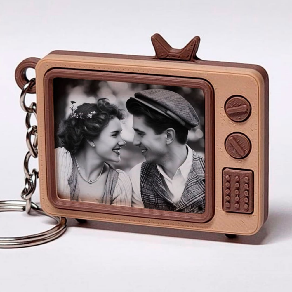 This retro TV-styled photo keychain is a charming, personalized accessory that allows you to carry cherished memories in a unique, vintage format.